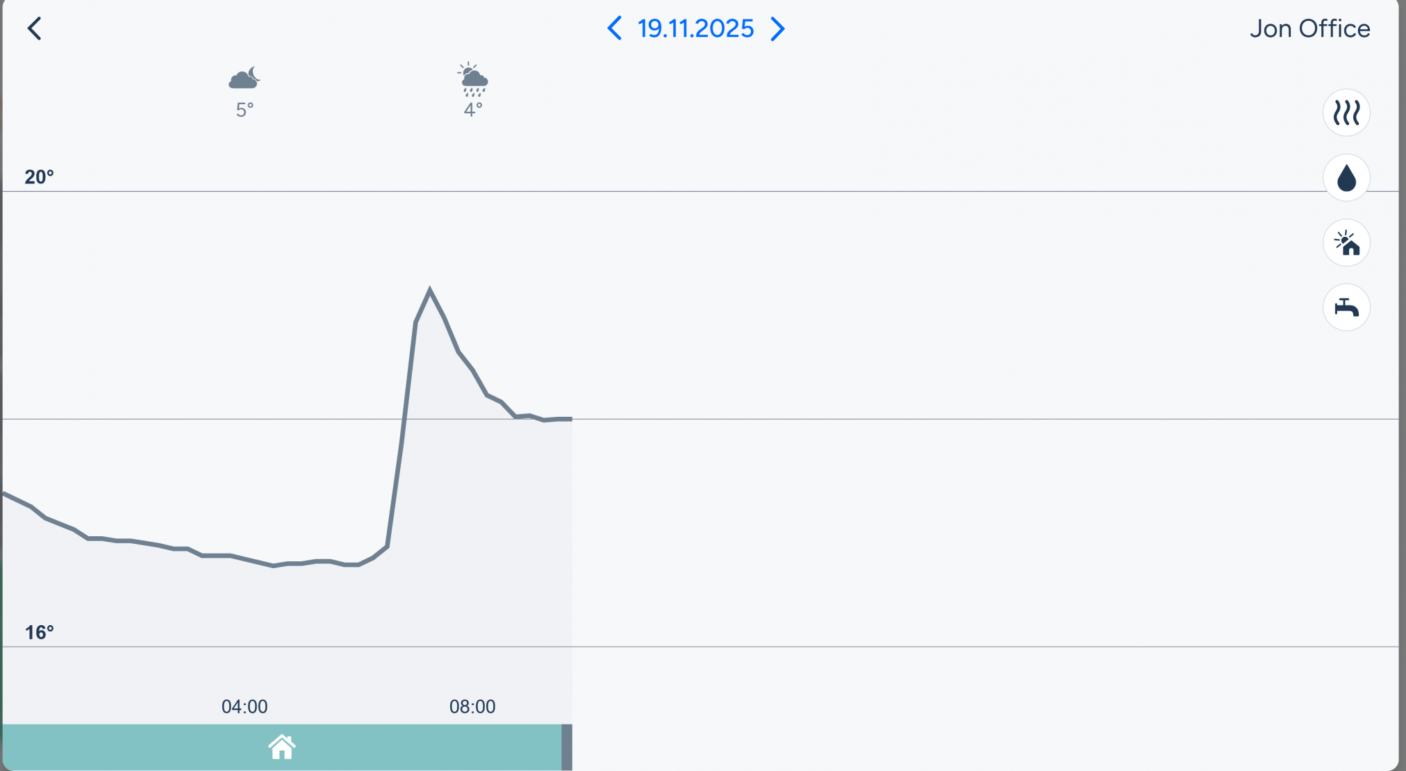 We can see from the readings from the smart radiator valve thermostat that the heating came on this morning for his office about 06:30. Even with the heat pump, the temperature rose to its setting of 19°C. All the cold air rushing past his office door then brought that temperature down to 18°C.