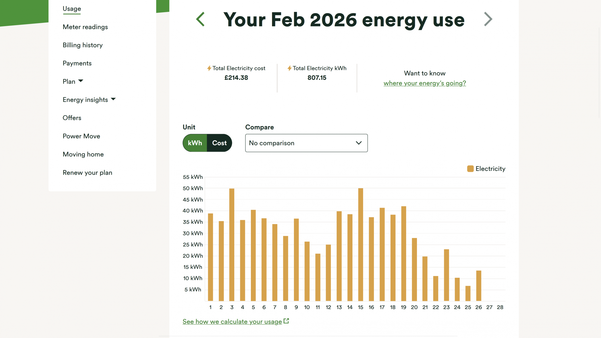 Compared to usage up to the 26th February 2025, we have used 170.7kWh less electricity, about £45.25 (and last year the electricity was more expensive).