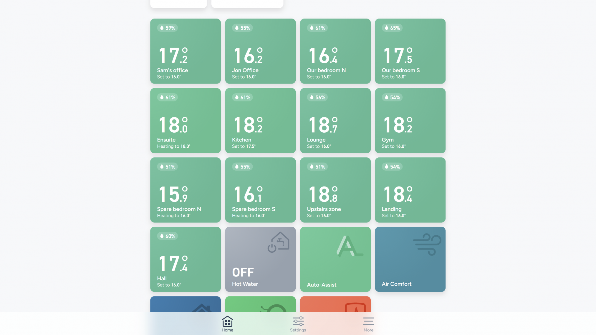 Inside, the temperatures are seen below – every room bar the garage has at least one thermostat in it, reporting how warm the inside of the rooms are.
